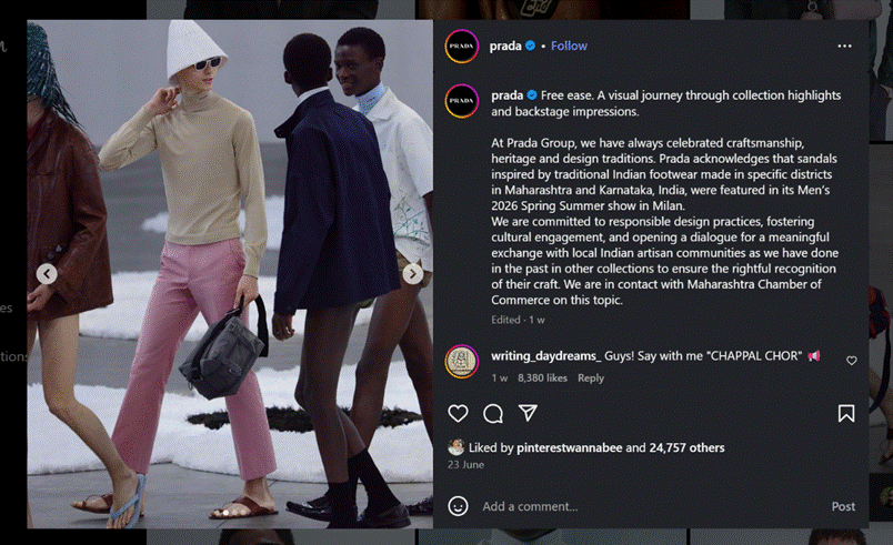 The Prada Spring/Summer 2026 Menswear Show sparked debate in India when models walked the runway wearing sandals that bore an uncanny resemblance to Kolhapuri chappals. What unsettled many was not merely the similarity in design but the familiar global pattern: cultural heritage is borrowed, rebranded as avant-garde, and showcased on elite platforms, while the communities who preserve and perfect these crafts are left invisible. In this case, centuries of tradition were reintroduced to the world as an “experimental” Prada design, without acknowledgement, context, or compensation for the original creators.
